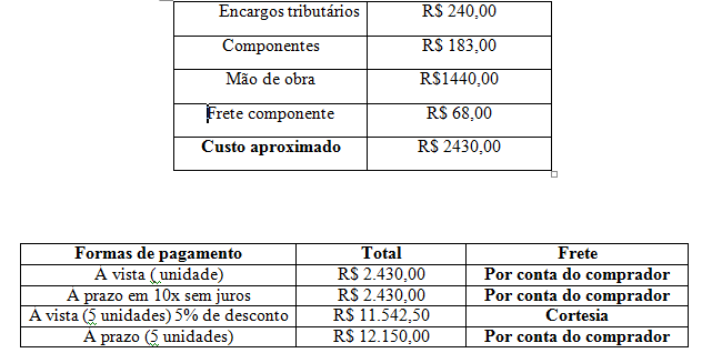 Segue abaixo a relação de custos para a produção e comercialização do nosso equipamento maiores informações favor entrar e contato conosco.